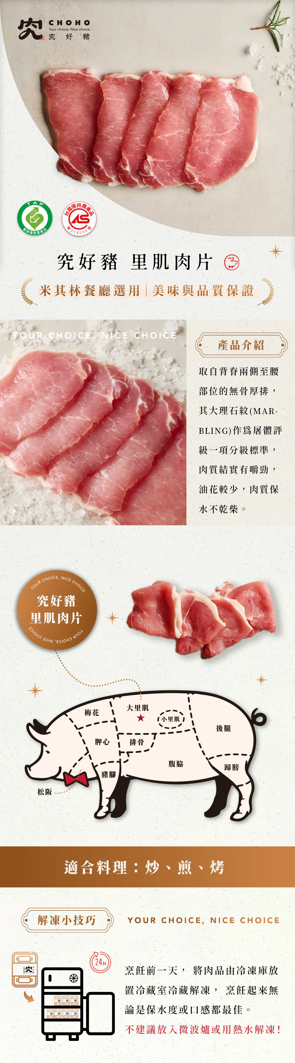 里肌肉質結實、瘦肉比例高、油脂少,口感鮮嫩且富有咬勁。