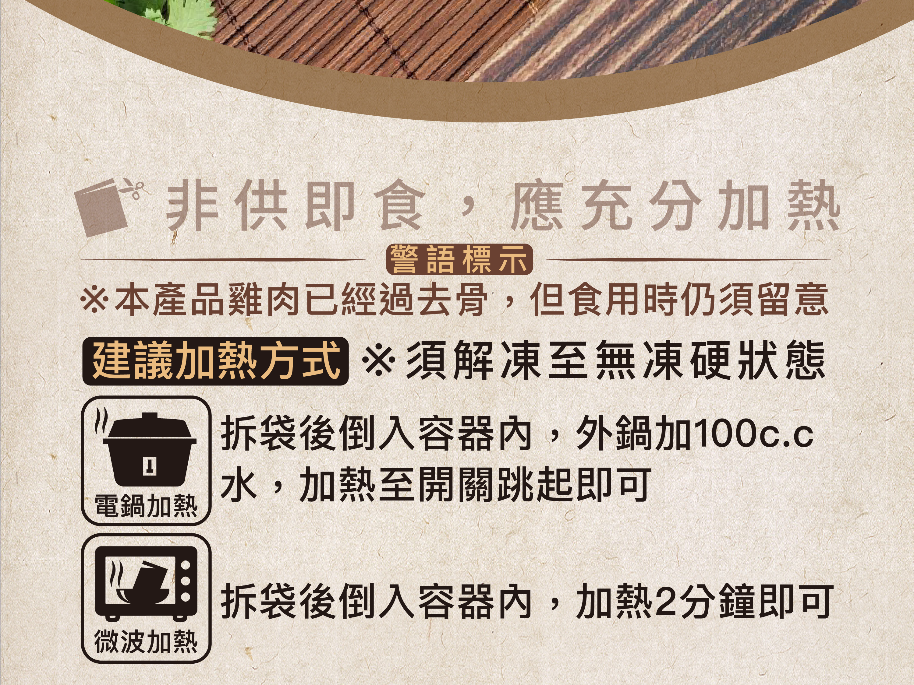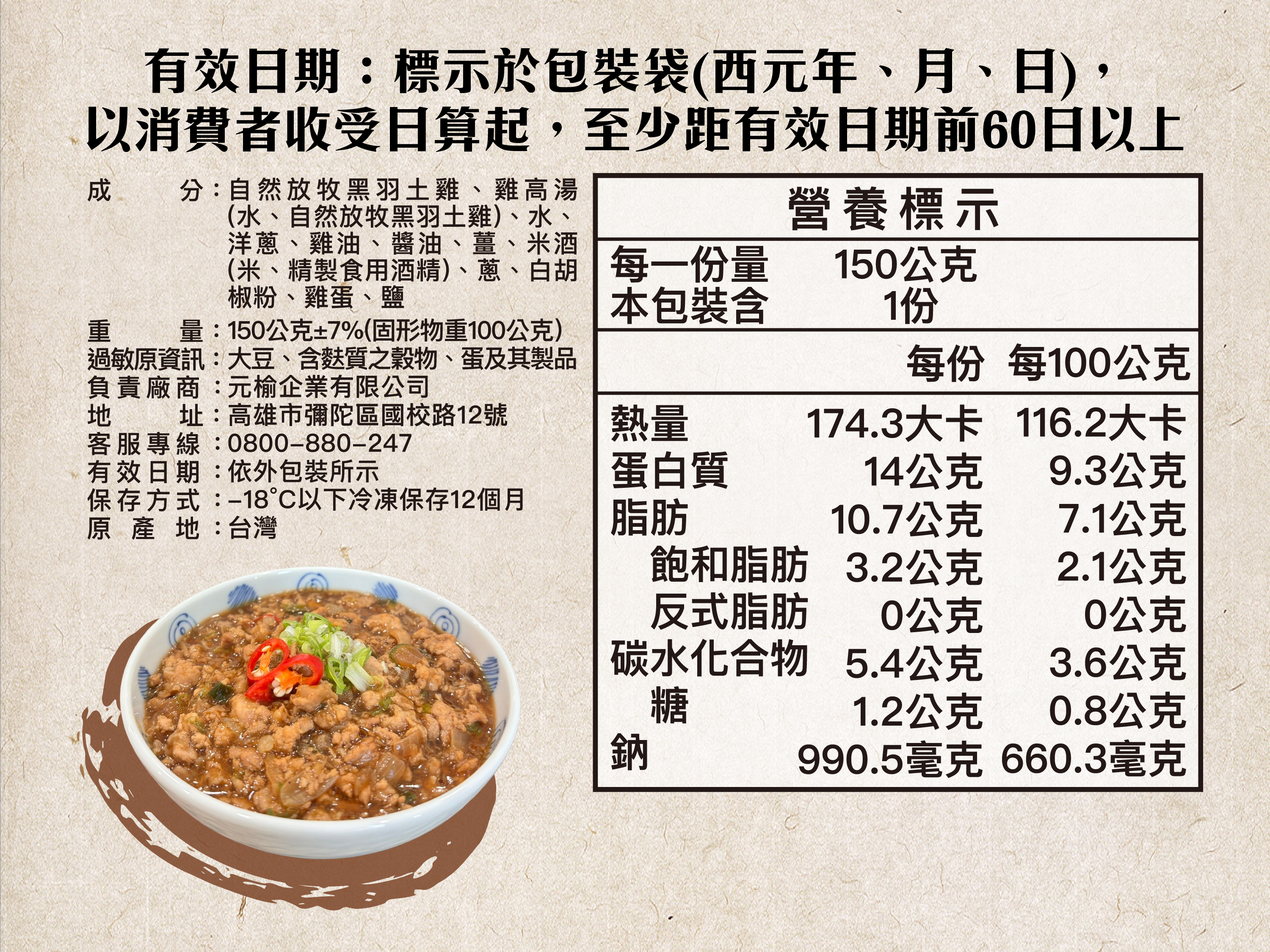 ✓ 成分:自然放牧黑羽土雞、雞高湯(水、自然放牧黑羽土雞)、水、洋蔥、雞油、醬油、薑、米酒(米、精製食用酒精)、蔥、白胡椒粉、雞蛋、鹽