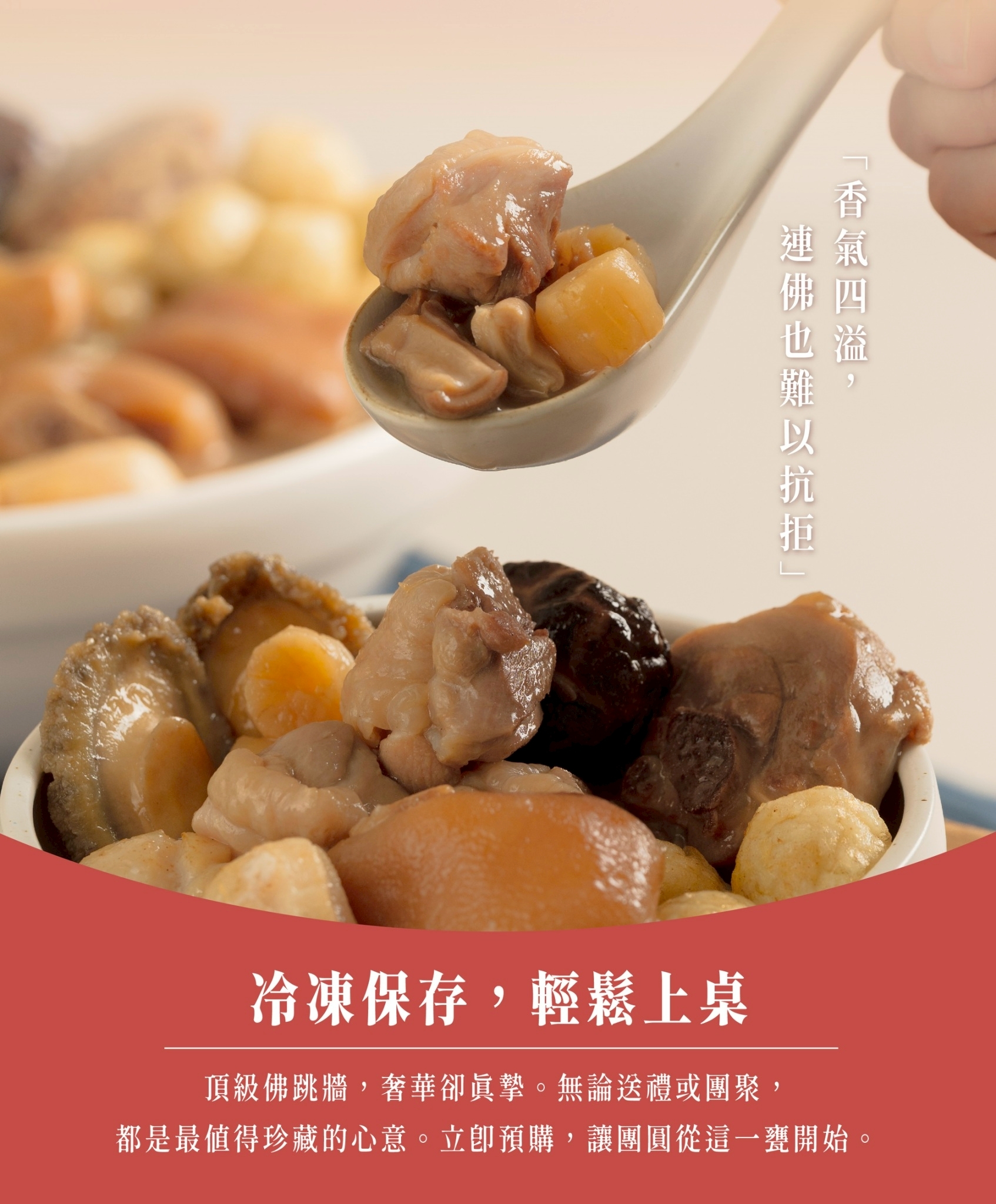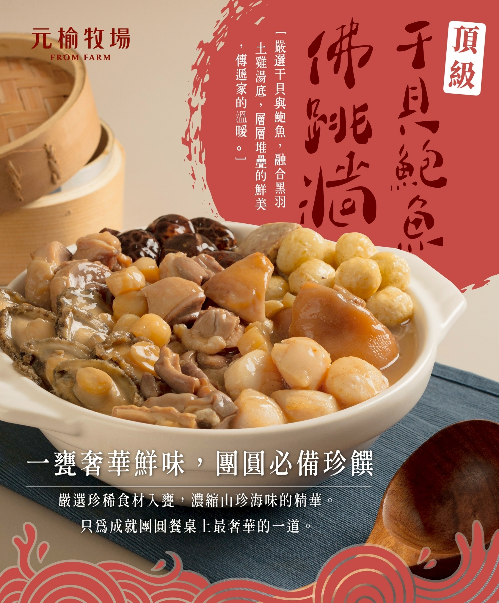 頂級干貝鮑魚土雞佛跳牆,嚴選珍稀食材入甕,濃縮山珍海味的精華。只為成就團圓餐桌上最奢華的一道。