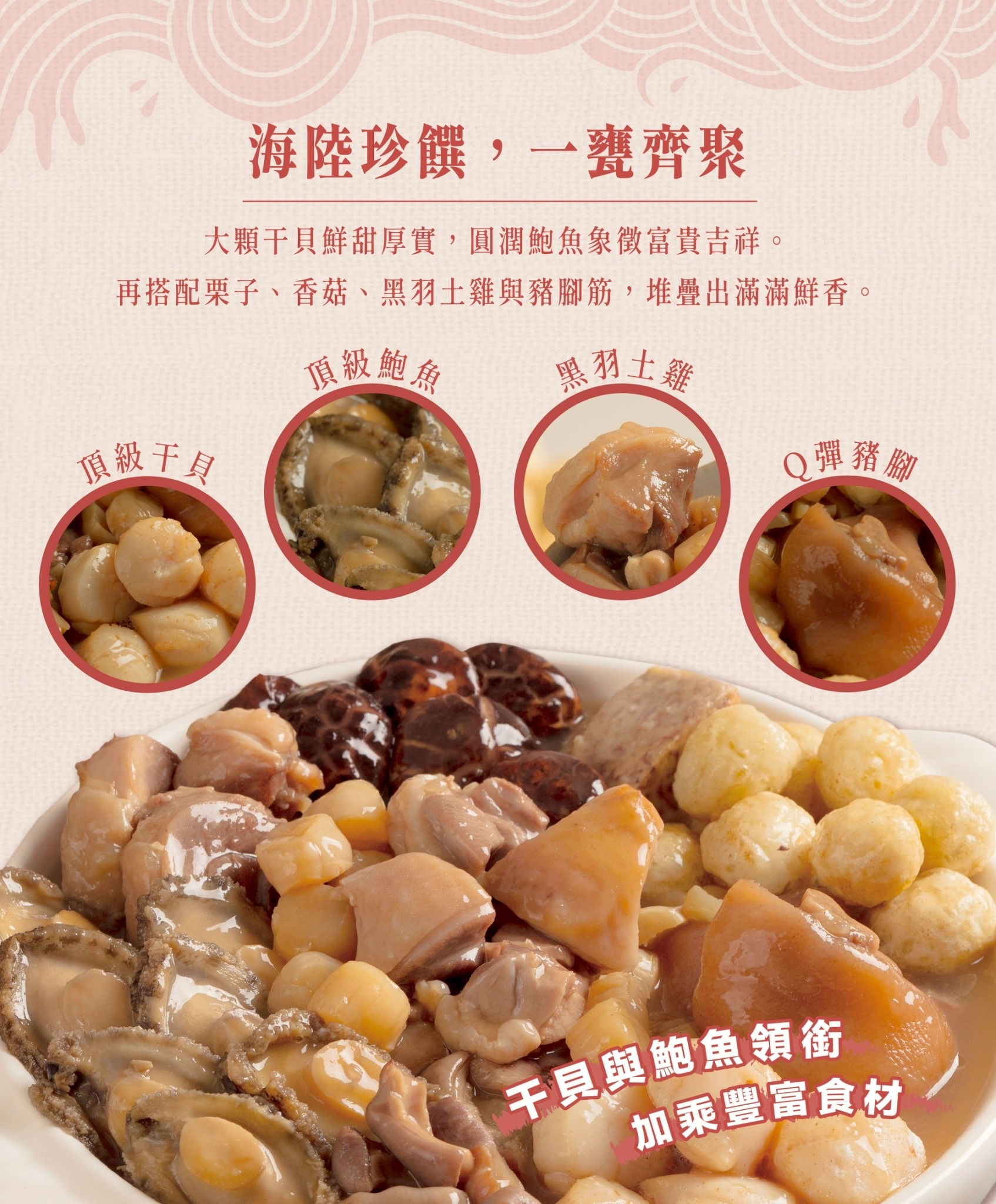 大顆干貝鮮甜厚實,圓潤鮑魚象徵富貴吉祥。再搭配栗子、香菇、黑羽土雞與豬腳筋,堆疊出滿滿鮮香。