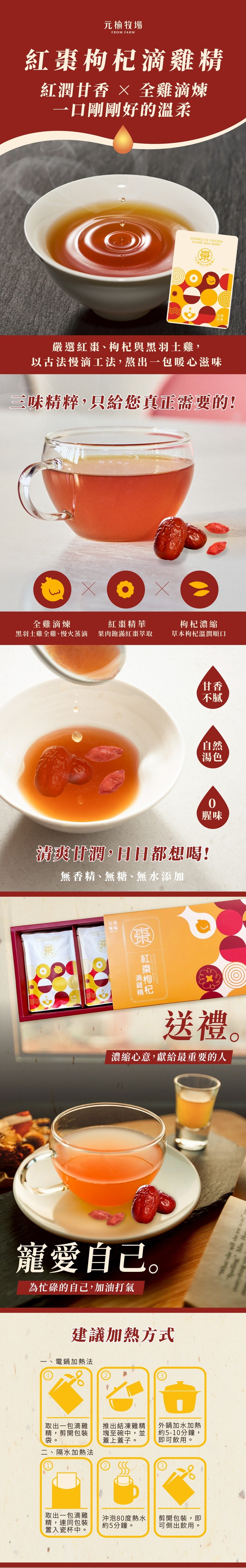 完全手工製作搭配慢火細燉20小時,我們有信心將最好、最營養的滴雞精與您和最愛的家人朋友分享!元榆滴雞精完全無添加水份,堅持天然健康、無添加、低卡零膽固醇。急速冷凍,不添加防腐劑,全程低溫宅配。